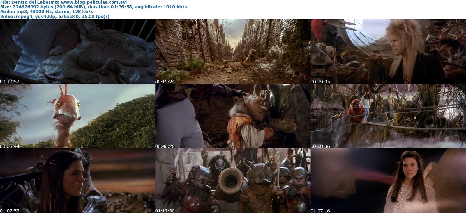 Sarah debe atravesar un laberinto para rescatar a su hermano pequeño, que ha sido secuestrado por los duendes y está en manos del poderoso rey Jareth. Sarah descubre, casi inmediatamente, que ha llegado a un lugar donde las cosas no son siempre lo que parecen. Dirigida por el creador de los Teleñecos. El guionista es Terry Jones, George Lucas es el productor ejecutivo y Frank Oz el animador.
